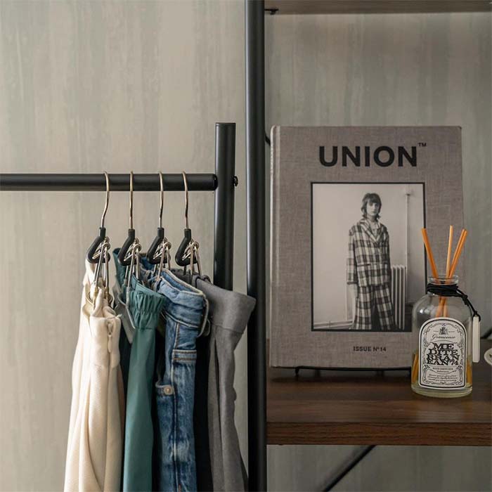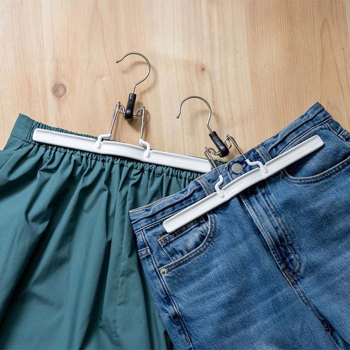 1日はいたスラックスはひざのところなどにシワが出来てしまいますが、このハンガーを使って裾のほうから吊るしておくと収納している間にシワを伸ばしてくれます。
