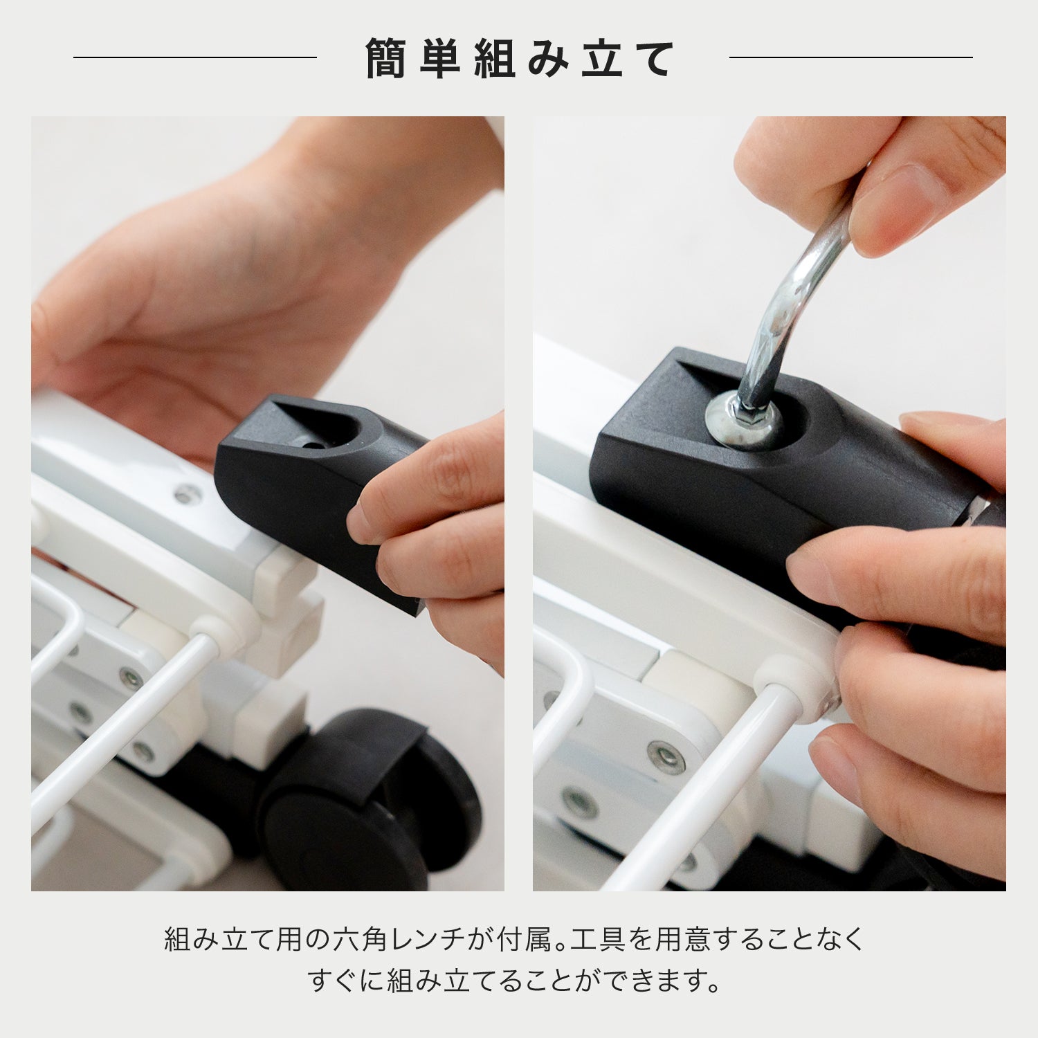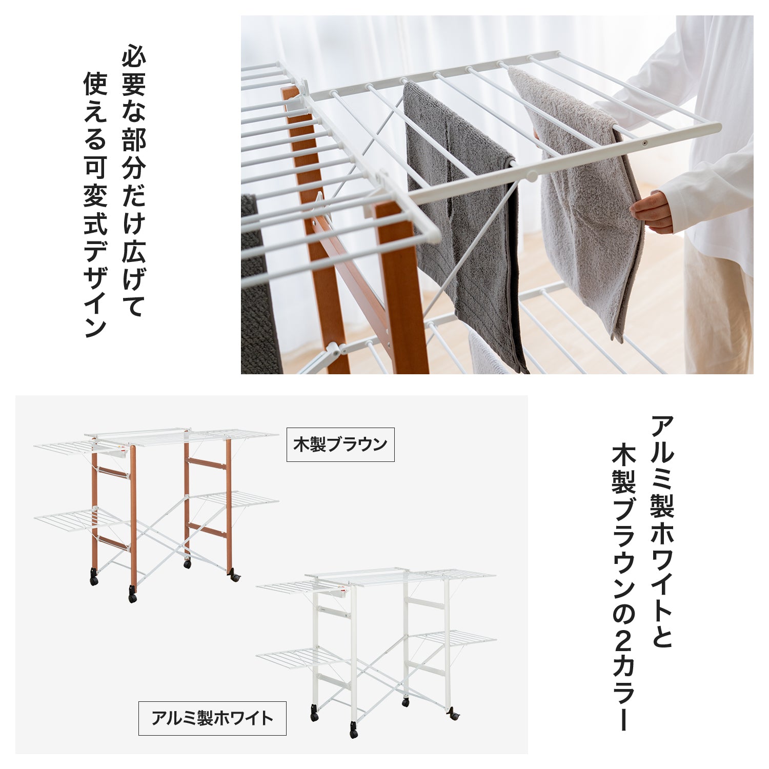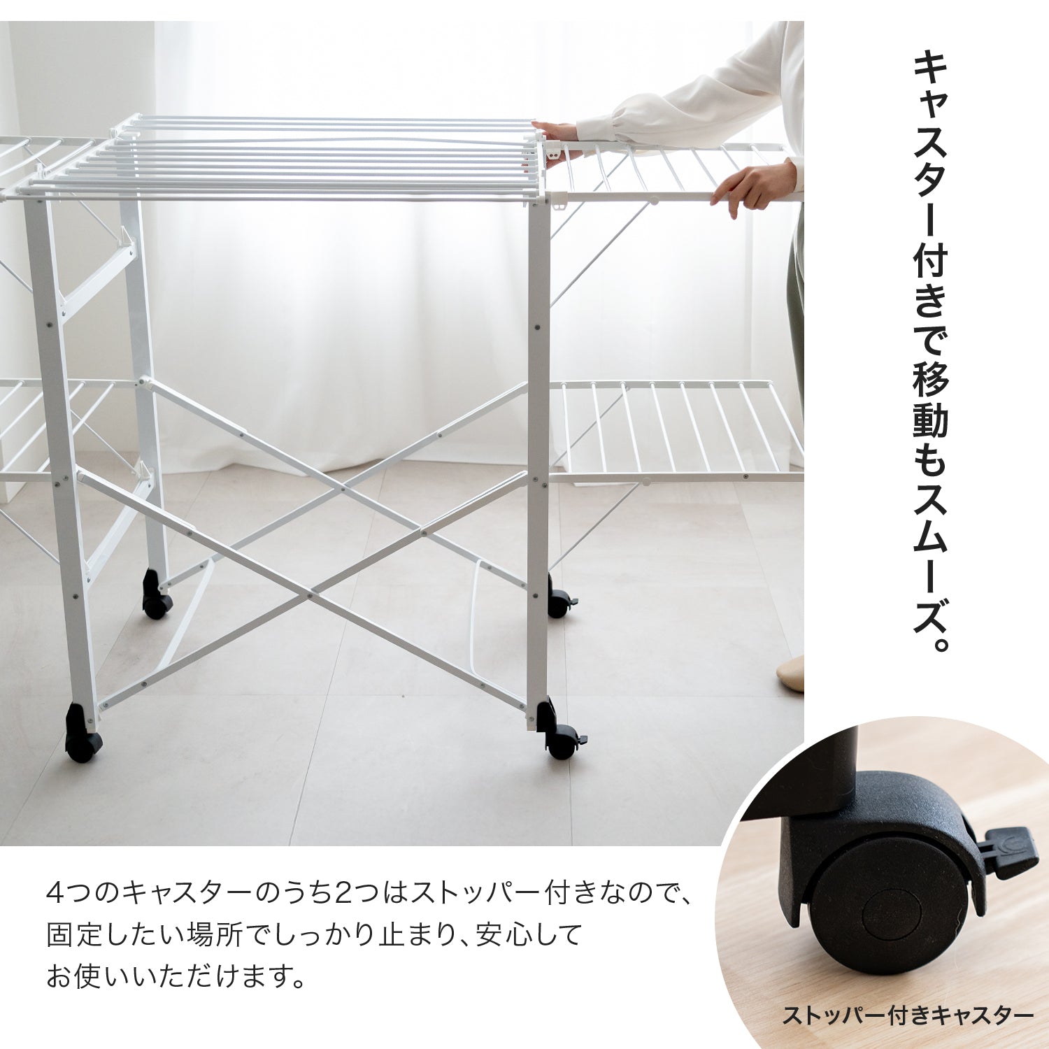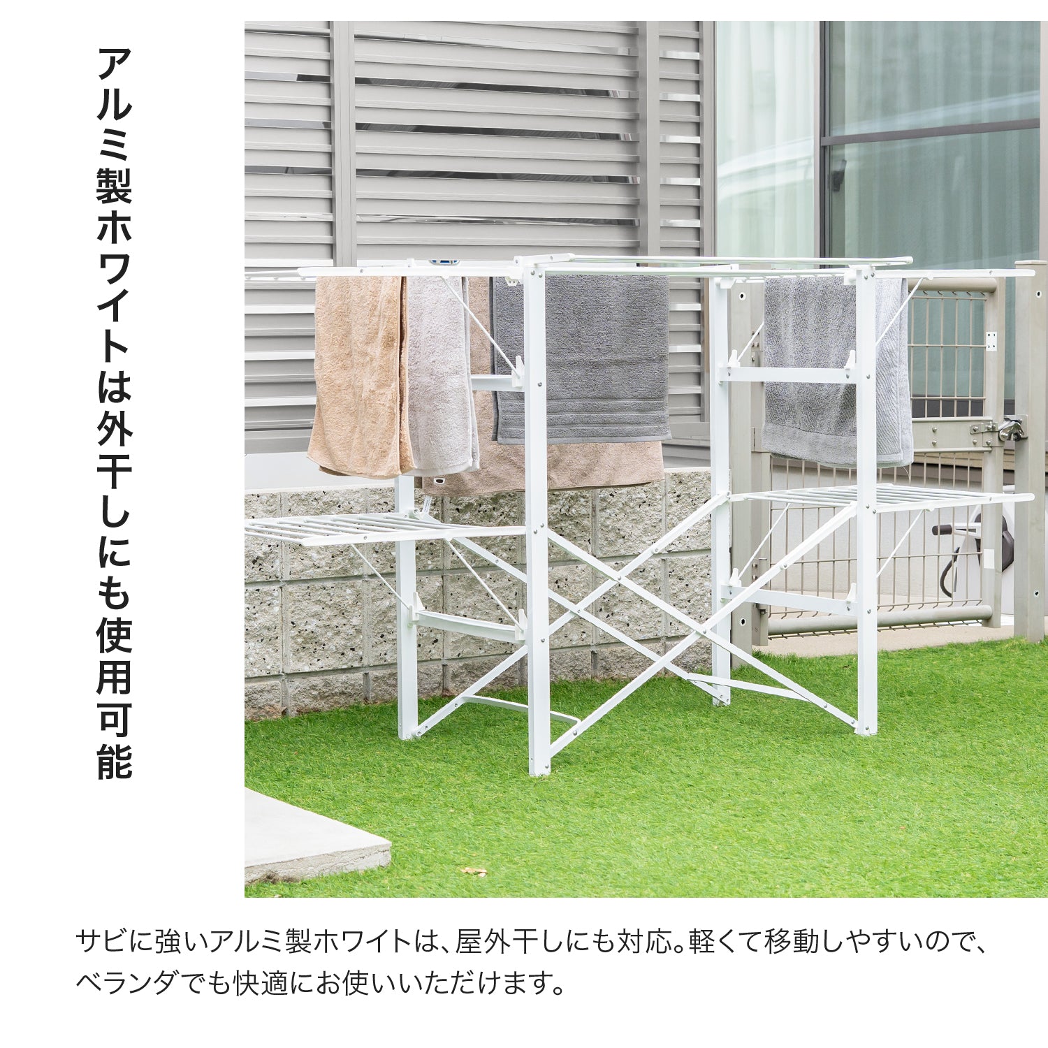 この物干しスタンドは、必要な部分だけを展開して使用できるため、大量の洗濯物を干す日も、少量の洗濯物を干す日も、場所を選ばずに最適な使い方が可能です。高さ104cmと低め設計で、高さ制限があるマンションでもストレスなく使用できます。さらに、洗濯バサミや小物を入れておくための便利なトレーが付いており、物干し作業をよりスムーズに行えます。