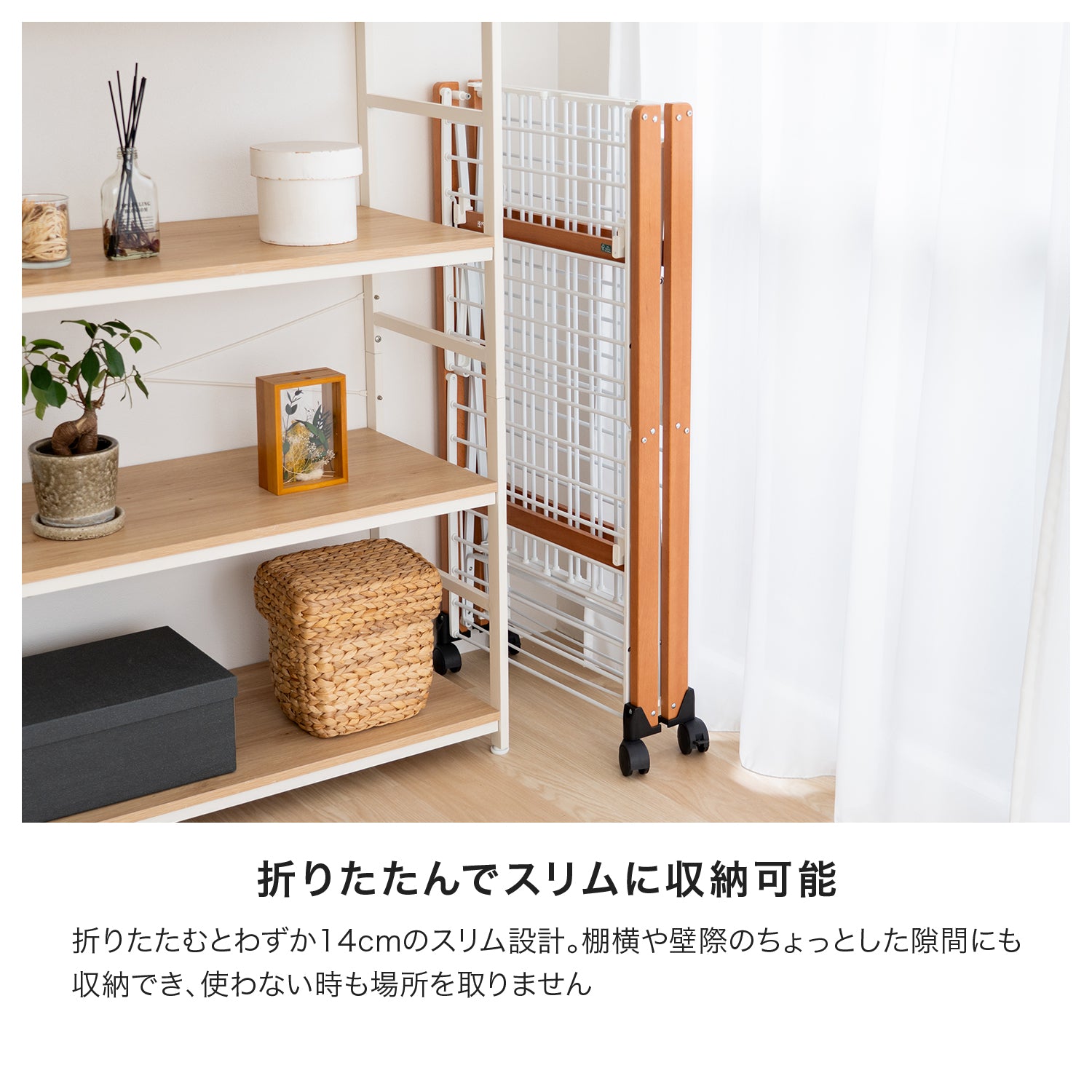 イタリア・フォッパペドレッティ製の折りたたみ式物干し「Gulliver」は、室内での使用に最適なデザインと機能性を兼ね備えています。天然木を使用したお洒落な外観は、インテリアとしても部屋の雰囲気を損なわず、どんな空間にも自然に溶け込みます。使用しない時は折りたたんで収納可能で、たたむとわずか14cmの薄さになるため、スペースを取りません。