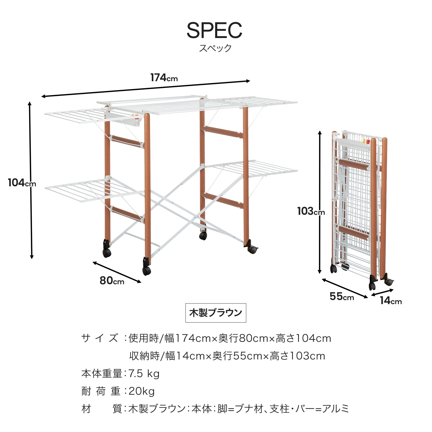○材質:木製ブラウン:本体:脚=ブナ材、支柱・バー=アルミ